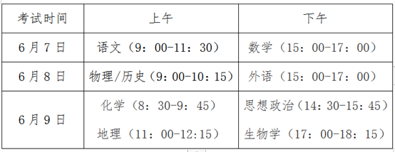 考试时间安排在6月7日-6月9日。语文科目考试时长为150分钟,数学、外语科目考试时长均为120分钟,选择性考试科目考试时长均为75分钟。具体考试时间为: