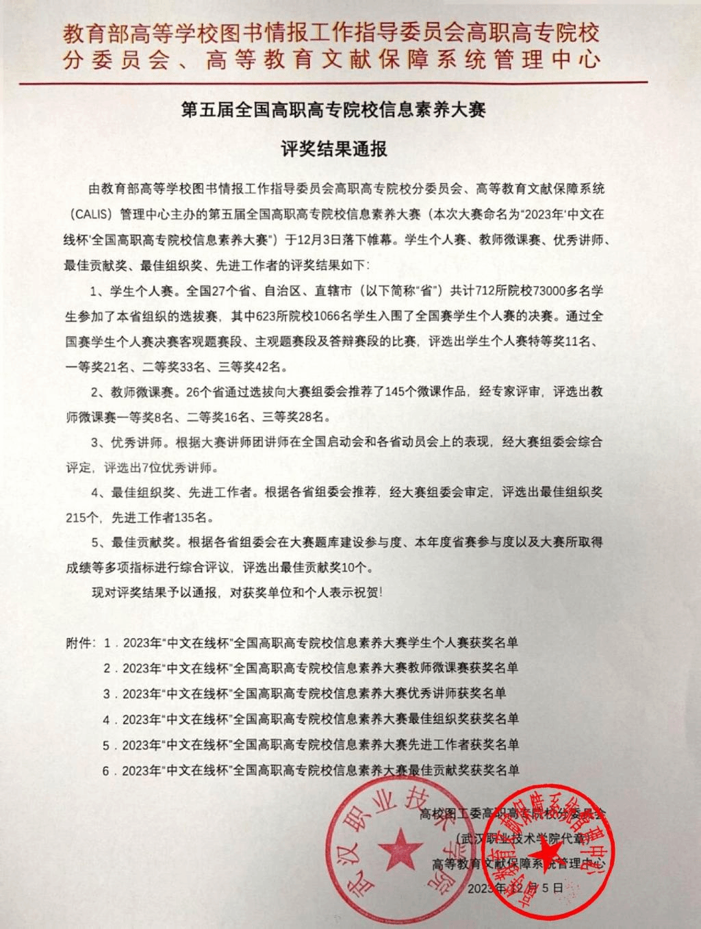 近日,教育部高等学校图书情报工作指导委员会高职高专院校分委会、高等教育文献保障系统(CALIS)管理中心主办了第五届全国高职高专院校信息素养大赛,全国27个省(自治区、直辖市)、712所院校参加比赛。