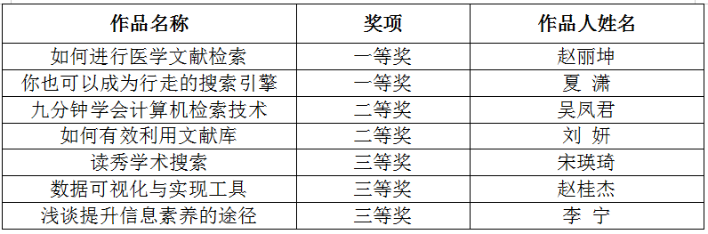 通过参与大赛,我校深入研究如何提升医学生的信息素养,为落实立德树人目标、培养创新人才做出积极探索,掀起信息素养竞赛的热潮,形成“比学赶帮”的良好局面,提升了我校师生信息素养水平,为信息素养教育持续全面发展提供动力。