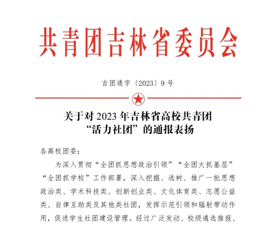 近日,共青团吉林省委发布了《关于对2023年吉林省高校共青团“活力社团”的通报表扬》(吉团通字〔2023〕9号)和《关于对2023年吉林省高校共青团“活力团支部”的通报表扬》(吉团通字〔2023〕10号),我校6个团支部、4个学生社团在此次评选中喜获佳绩。