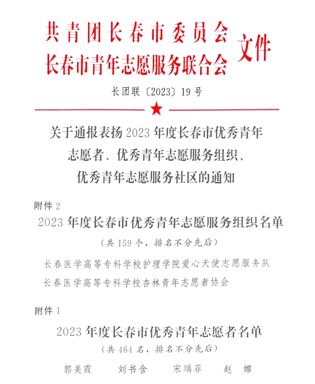 近日,共青团长春市委员会、长春市青年志愿服务联合会发布了《关于通报表扬2023年度长春市优秀青年志愿者、优秀青年志愿服务组织、优秀青年志愿服务社区的通知》(长团联[2023]19号),我校杏林青年志愿者协会、护理学院爱心天使志愿服务队荣获“2023年度长春市优秀青年志愿服务组织”称号,护理学院刘书含、临床医学院宋瑀菲、药品食品学院赵娜、健康学院郭美霞荣获“2023年度长春市优秀青年志愿者”称号。