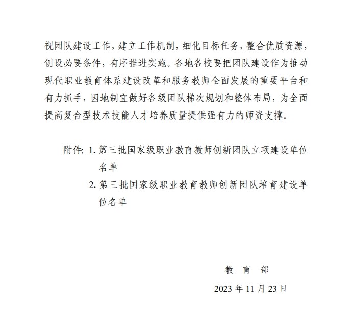 据悉,2019年,教育部启动实施了全国职业院校教师教学创新团队建设项目,三年为一个建设周期,面向全国中、高等职业学校和应用型本科高校,聚焦战略重点产业领域和民生紧缺领域专业,分年度、分专业建设各级各类创新团队。