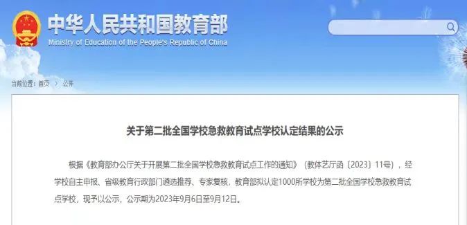 近日,教育部办公厅公布了第二批全国学校急救教育试点学校名单。此次全国共遴选1000所学校参与试点工作,旨在推动在全国的大中小校园内配备急救设施设备,加强教职工、学生急救知识教育和技能培训,探索和积累可复制、可推广的急救教育经验做法,完善学校急救教育育人体系。