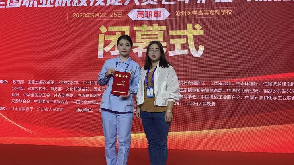 9月23日至24日,2023年全国职业院校技能大赛高职组首届老年护理与保健赛项在沧州医学高等专科学校举行,来自全国28个省份的54支代表队参加了此项大赛,我校护理专业2021级学生石聪聪荣获三等奖。