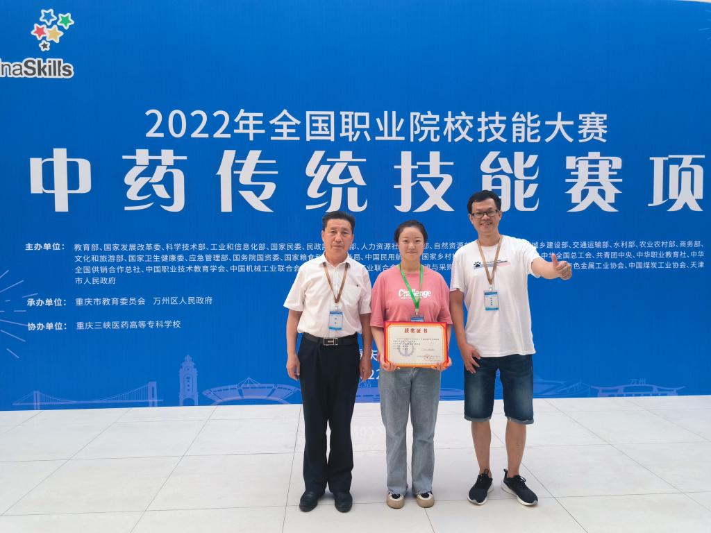 7月28日至30日,2022年全国职业院校技能大赛高职组中药传统技能赛项在重庆三峡医药高等专科学校举办,我校韩松雪同学荣获三等奖。