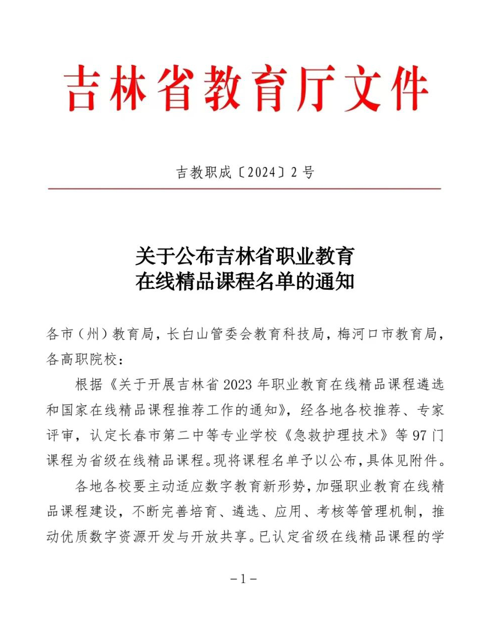 近日,吉林省教育厅下发了《关于公布吉林省职业教育在线精品课程名单的通知》,我校《妇产科护理》等6门课程被认定为2023年吉林省职业教育在线精品课程。另外,《生药学》和《儿科学》两门课程被教育厅推荐参评2023年国家级在线精品课程。