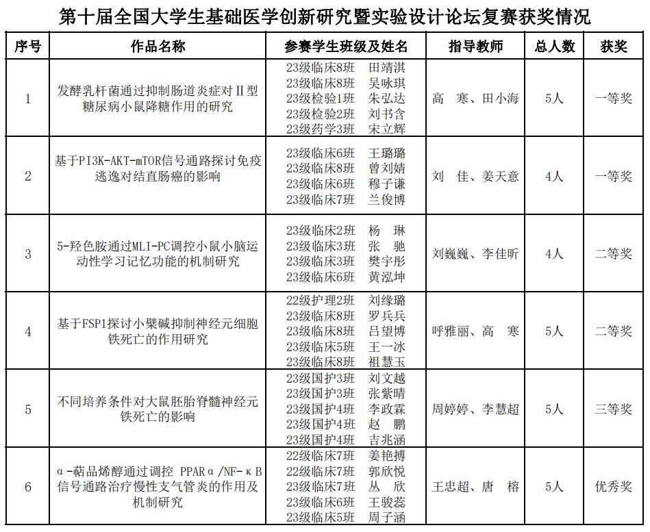 全国大学生基础医学创新研究暨实验设计论坛是我国基础医学领域最高级别的学生学科竞赛之一,大赛以“崇尚科学、追求真知、勇于创新、公平公正”为宗旨,不仅考验学生创新能力和实验技能,更考验新医科建设背景下教师教学能力。学校坚持“以赛促学、以赛促教、以赛促改”,通过本次比赛进一步强化科教协同育人,推动拔尖创新人才的培养;进一步激发医学生的创新意识,培养创新精神和实践能力,对推动基础医学教育创新发展、全面提高医学生培养质量具有重要的意义。
