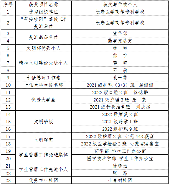 近日,中共长春市委教育工作委员会发布了《关于公布2023年度长春市“高校文明杯”竞赛活动先进集体和先进个人的通知》,我校荣获12项集体荣誉和11项个人荣誉,名单如下: