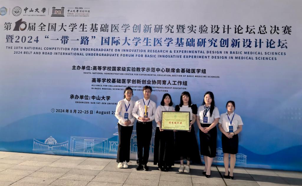 8月23-25日,由高等学校国家级实验教学示范中心联席会基础医学组、高等学校基础医学创新创业协同育人工作组主办,中山大学承办的“第十届全国大学生基础医学创新研究暨实验设计论坛”总决赛在中山大学圆满落幕。我校喜获金奖1项、银奖1项、铜奖2项、最佳风采奖1项、高校优秀组织奖1项共6项荣誉,创造了历史最好成绩。