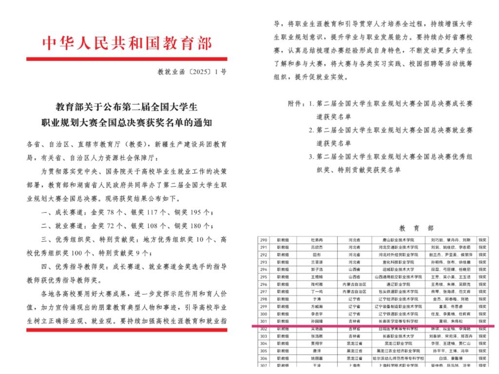7 月 29 日,教育部官网以教就业函〔2025〕1 号文件正式公布全国第二届大学生职业规划大赛获奖名单,标志着这场覆盖全国高校的职业规划盛会圆满落幕。我校健康学院康复治疗技术专业的孙国璋同学,在招生就业处、思政部和健康学院相关教师的共同指导下凭借出色表现荣获大赛就业赛道国家级铜奖,为学校和吉林省赢得荣誉。