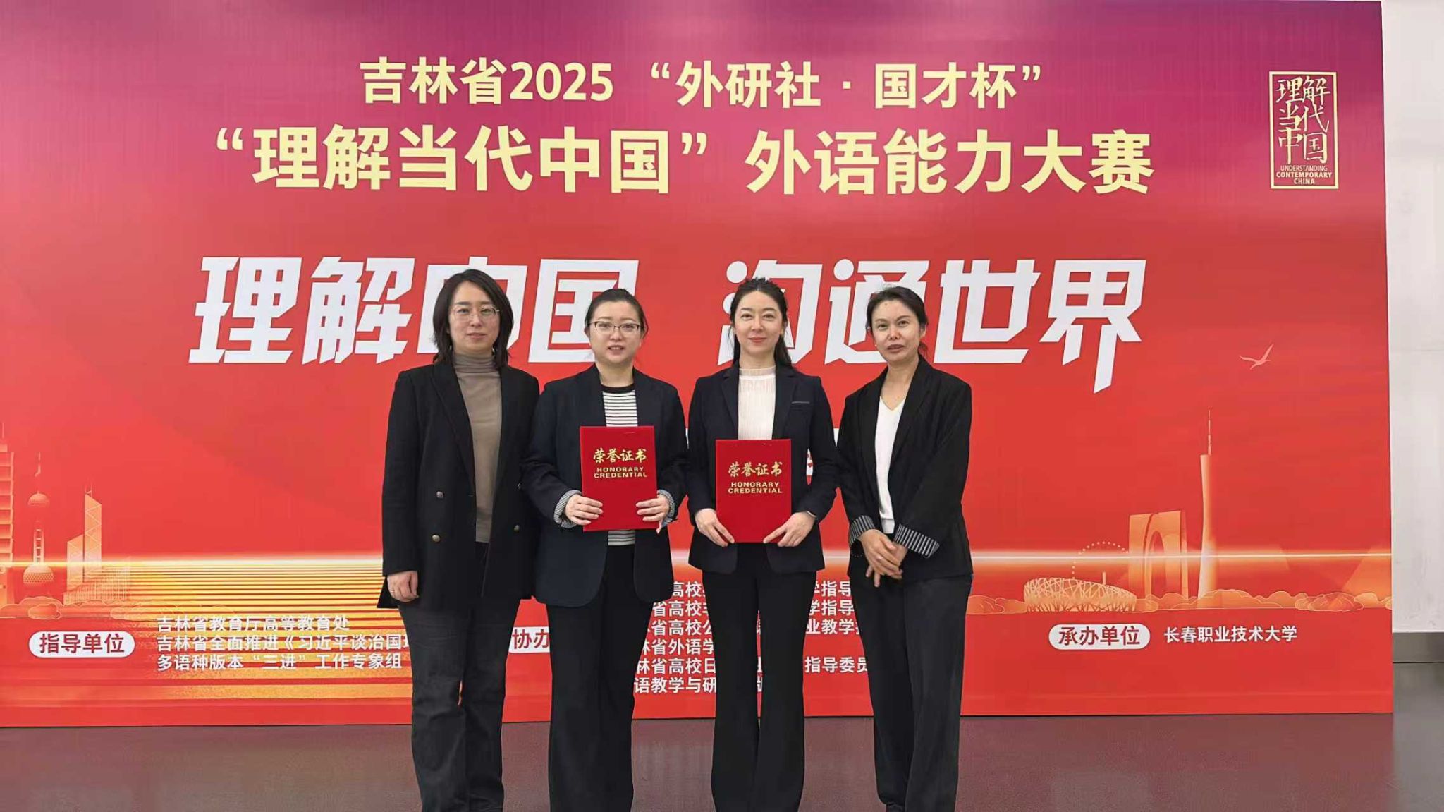 11月8日,2025“外研社・国才杯”“理解当代中国”外语能力大赛高职教师组吉林省决赛在长春职业技术大学圆满落幕。作为吉林省首次举办的高职英语教师专项赛事,本次竞赛汇聚了全省近30支优秀教师队伍同台竞技。我校教师团队凭借扎实的专业功底、创新的教学设计与出色的现场表现脱颖而出,一举夺得金奖第一名,成功斩获代表吉林省晋级全国总决赛的资格,为学校赢得重要荣誉,充分彰显我校外语教学的过硬实力。
