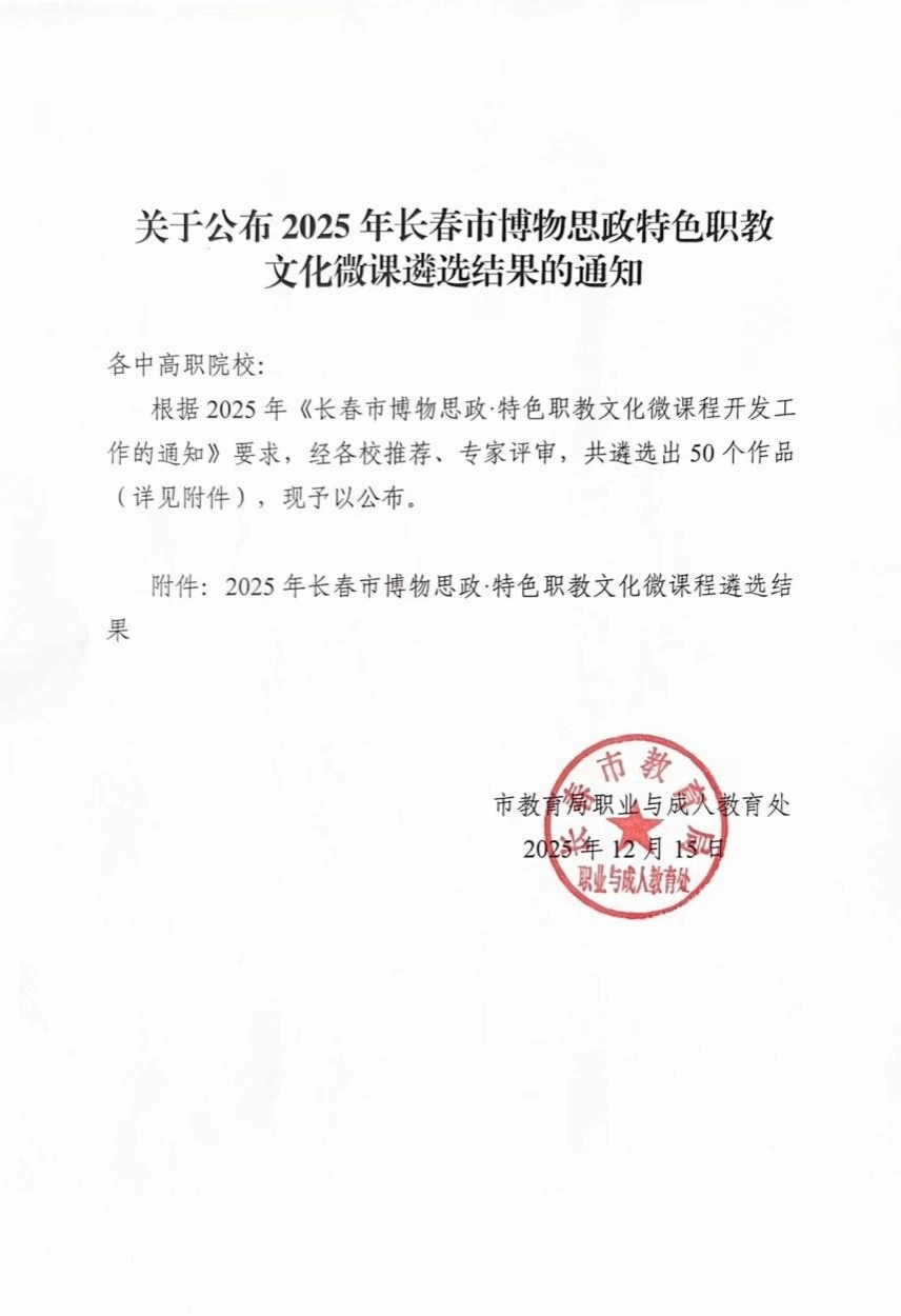 近日,长春市教育局公布2025年博物思政・特色职教文化微课程遴选结果。此次遴选严格遵循“深挖职教思政元素、打造特色育人品牌”工作要求,经各校推荐、专家评审,共遴选出50部市级示范课程。我校报送的13部作品成功入选,入选数量位居全市参评院校首位,充分彰显了学校在落实“博物思政”建设部署、深化课程思政改革、培育特色职教文化方面的扎实功底与突出实力。